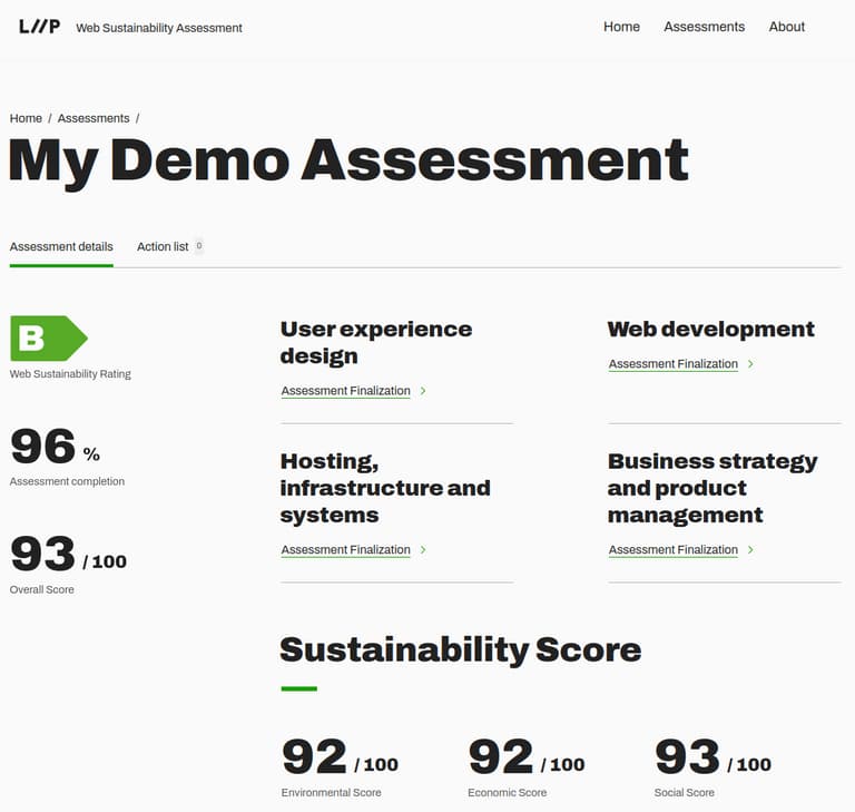We built an assessment platform for the W3C Web Sustainability Guidelines. These guidelines come in the form of a large questionnaire asking about best practices for sustainable web applications. We added a grading system that awards grades for each chapter of the guidelines. Each question is worth points. The more impact the question has, the more points it awards. From on the achieved percentage of the maximum attainable points, we grade the project sustainability from A (best) to G (worst).